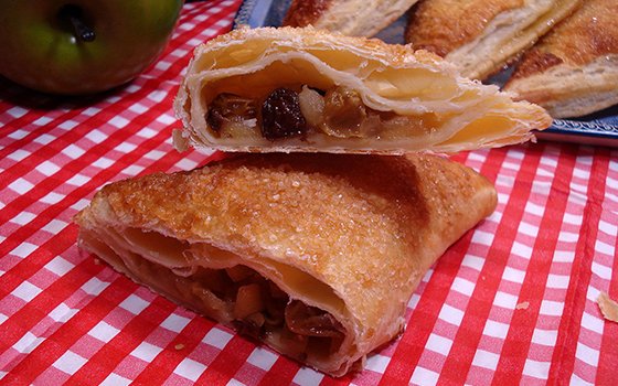 Ponemos en un extremo de cada cuadrado una cucharada colmada de relleno de manzana.